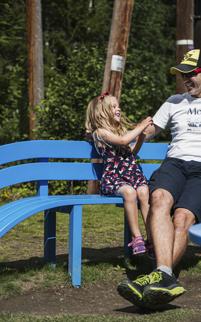 Det er fem forskjellige slike blå benker plassert på forskjellige steder i parken, kan du finne alle fem?